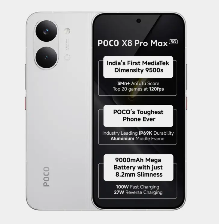 Poco X8 Pro Max₹42,999 (~₹40,800 w/ offers)GamersDimensity 9500S9000mAh